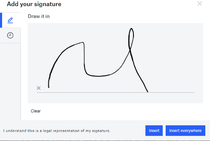 4. Once the signature is created, you can "insert" into the specific field or "insert everywhere" for the rest of the document to be automatically fill.